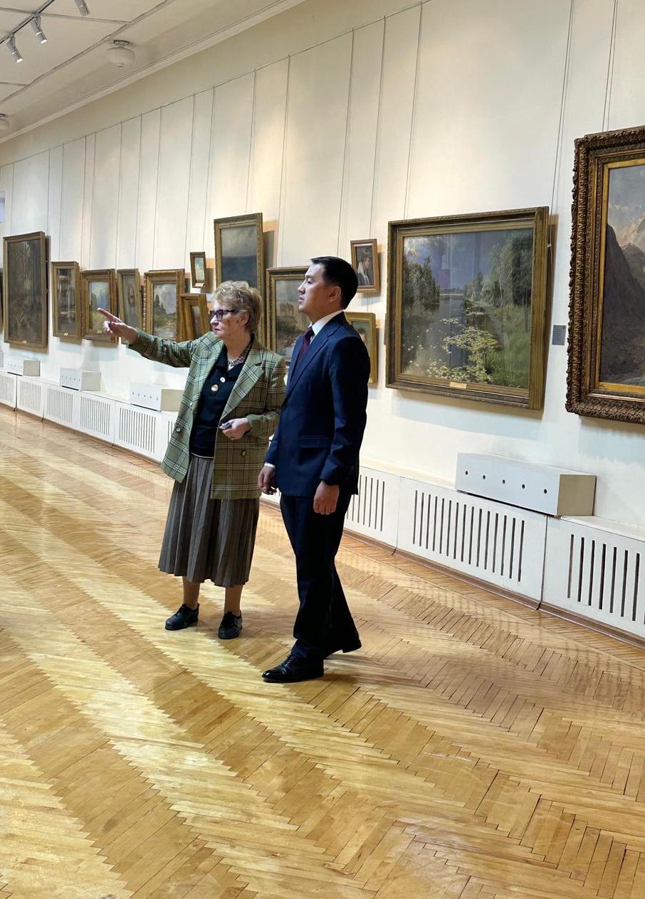 В Областном музее изобразительных искусств имени семьи Невзоровых побывал заместитель акима области Абай Мейрлан Акылбекович Раханов. Гостя встретила и провела экскурсию по залам музея директор учреждения Татьяна Александровна Стромская.