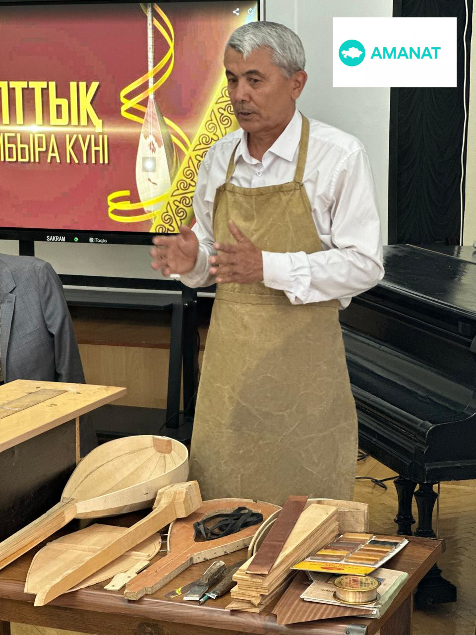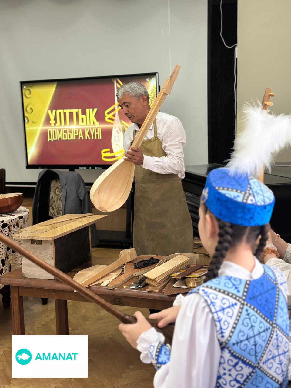 Актовый зал музея, служивший когда-то театром наполнился особым настроением — здесь соединились прошлое и настоящее, мастерство и вдохновение. В центре внимания — человек, чьи руки возвращают к жизни дерево, превращая его в голос степи. Елзат Шарбатович Даирбаев — скульптор, педагог и мастер по изготовлению домбры, признанный в нашем крае. Его инструменты звучат в руках учеников, артистов, и тех, кто слышит в домбре не только ноты, но и зов предков. А рядом — будущее. Улыбчивые – дети из творческого центра «Тамаша», вместе с чутким наставником Галией Есимхановной Оразгалиевой. Они пришли не просто послушать — они пришли почувствовать. Познакомиться с тем, что скрыто за звучанием: форма, дерево, дыхание времени.